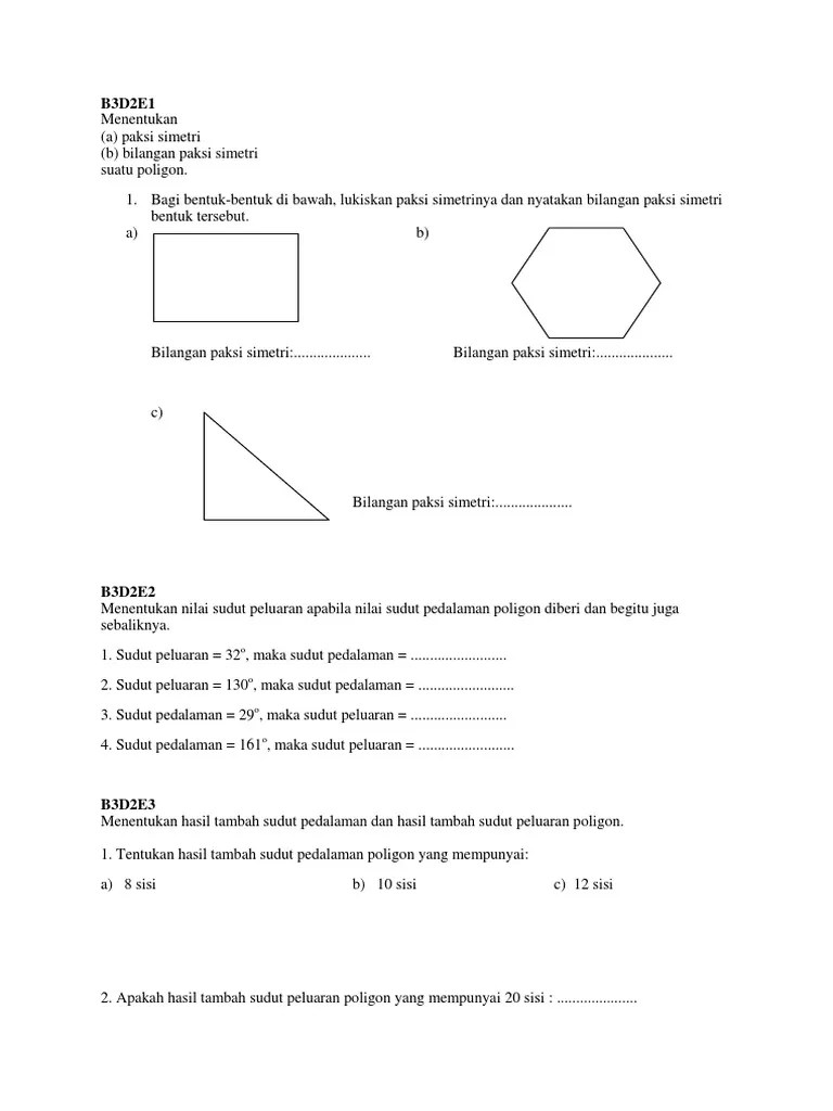 Lapan (8) bilangan paksi simetri: Berapakah bilangan sisi bagi poligon di atas? Bilangan paksi simetri bagi sebuah poligon sekata dengan n sisi ialah ______. Which of the following polygons has the most . Bil sisi dan paksi simetri. Axis of symmetry is a line that divides an object into 2 equal parts.